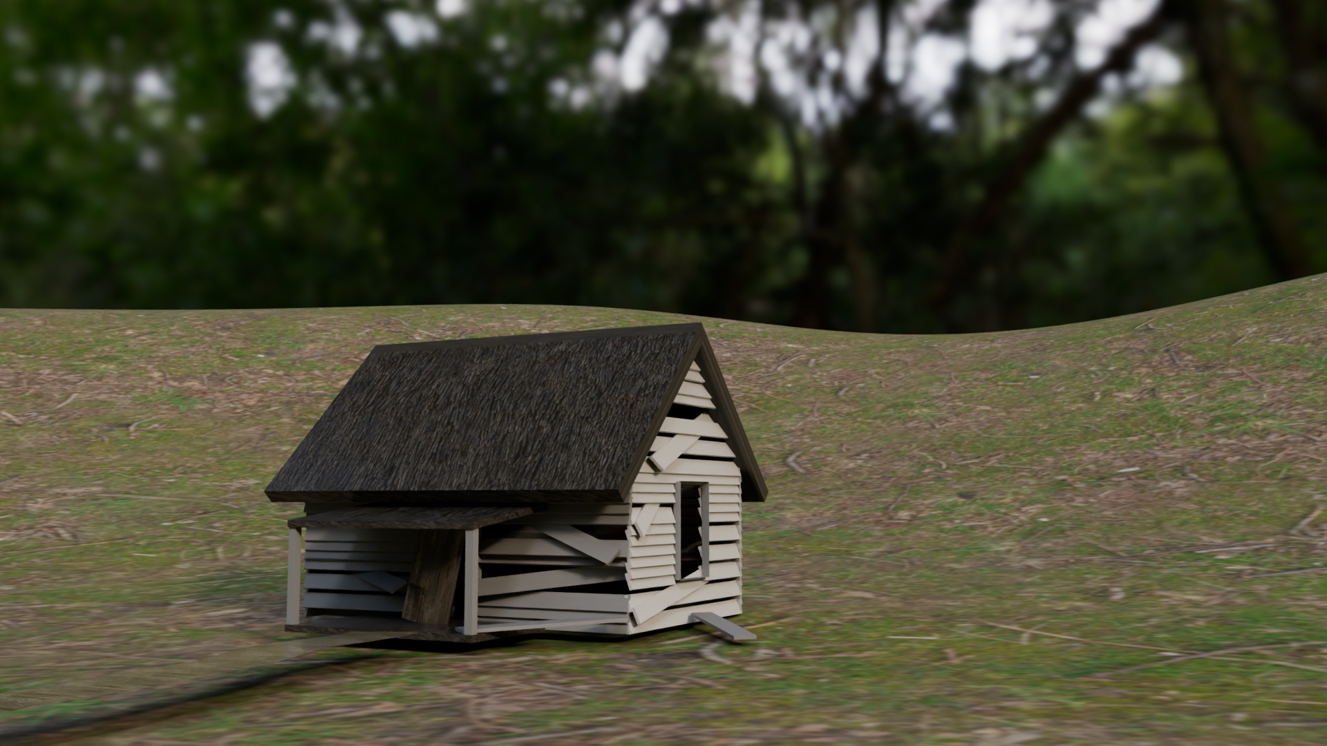 It is small, perhaps built for a single resident. The soundness of the structure is questionable. You step onto the porch and inspect the entrance. A lone door hangs crooked, held by a broken hinge and a single nail. At some point, someone nailed the door shut. Now, that hinge and nail are the only things keeping the door attached to the house. It creaks softly in the wind.
