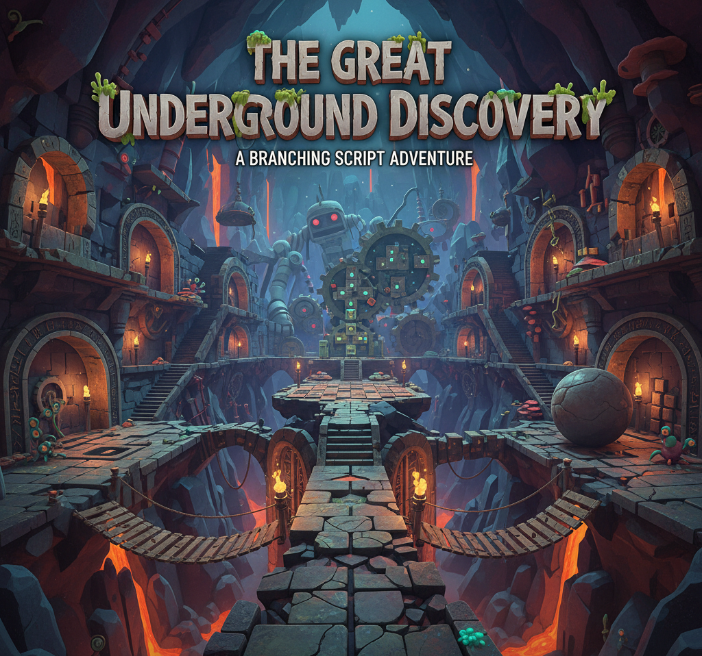 A branching script where the character discovers a ruined civilization filled with,dangers, mazes, and puzzles based on the Zork game.